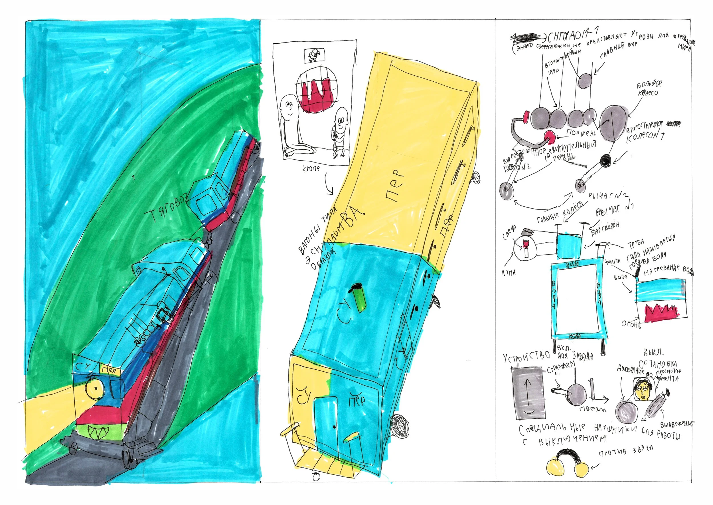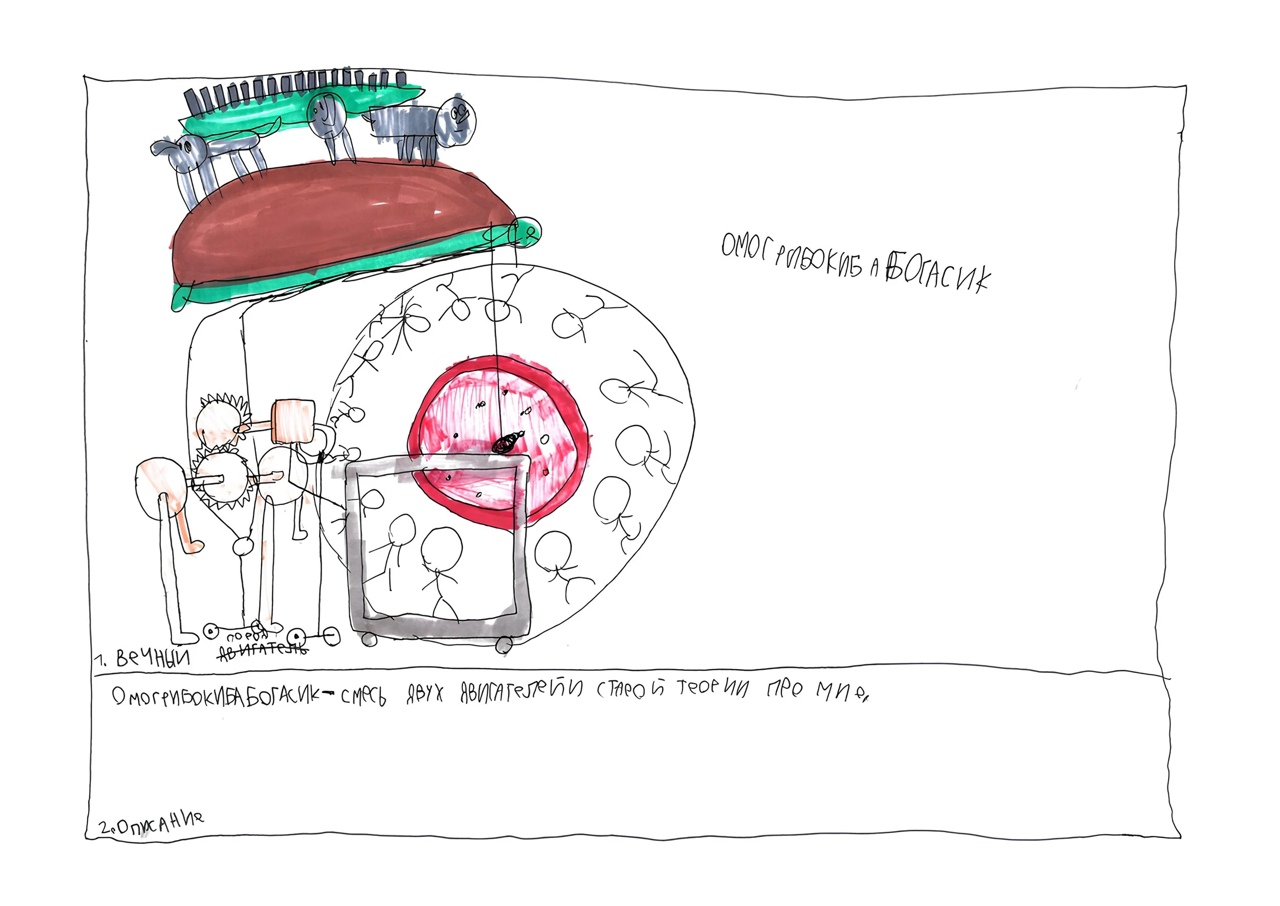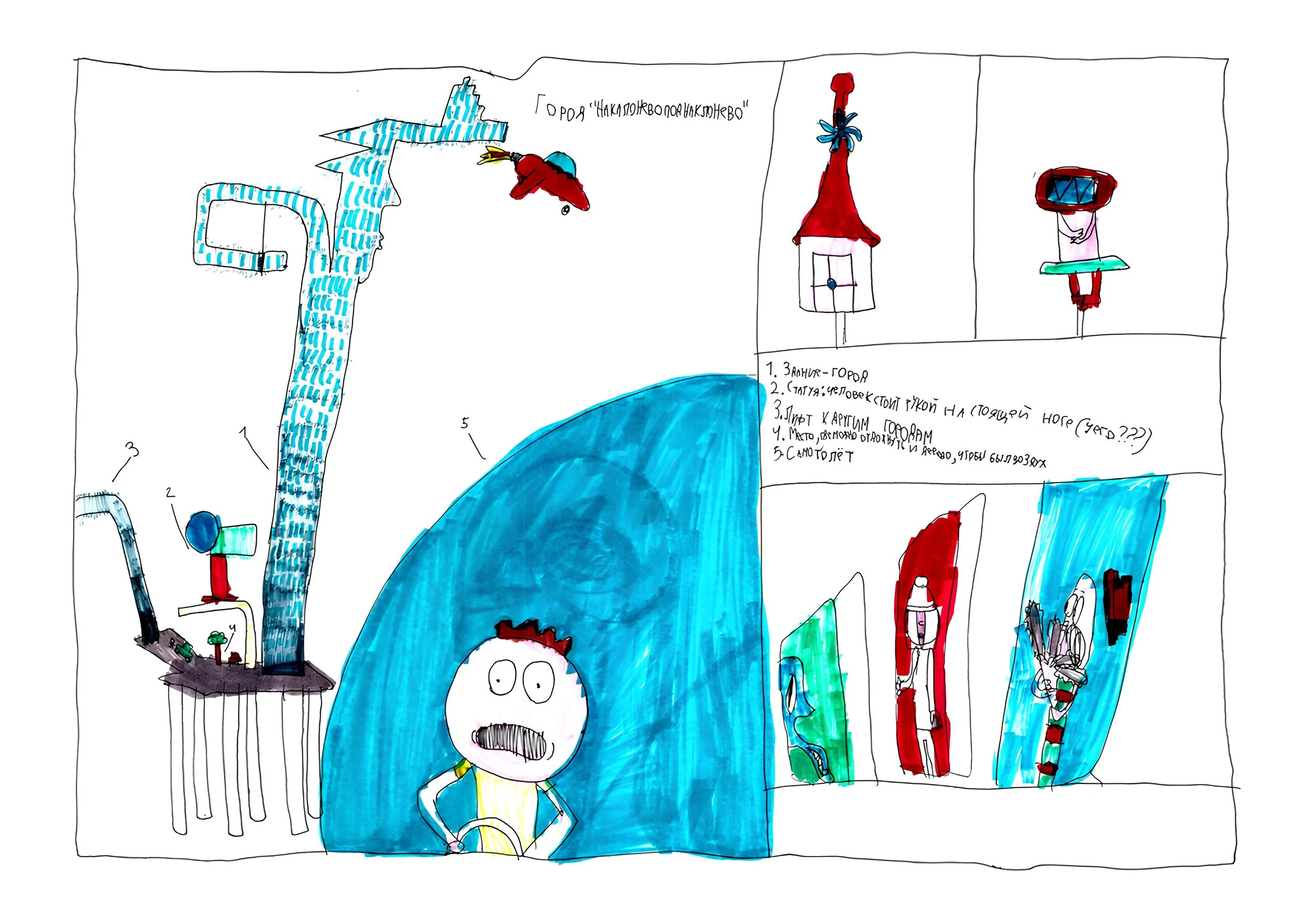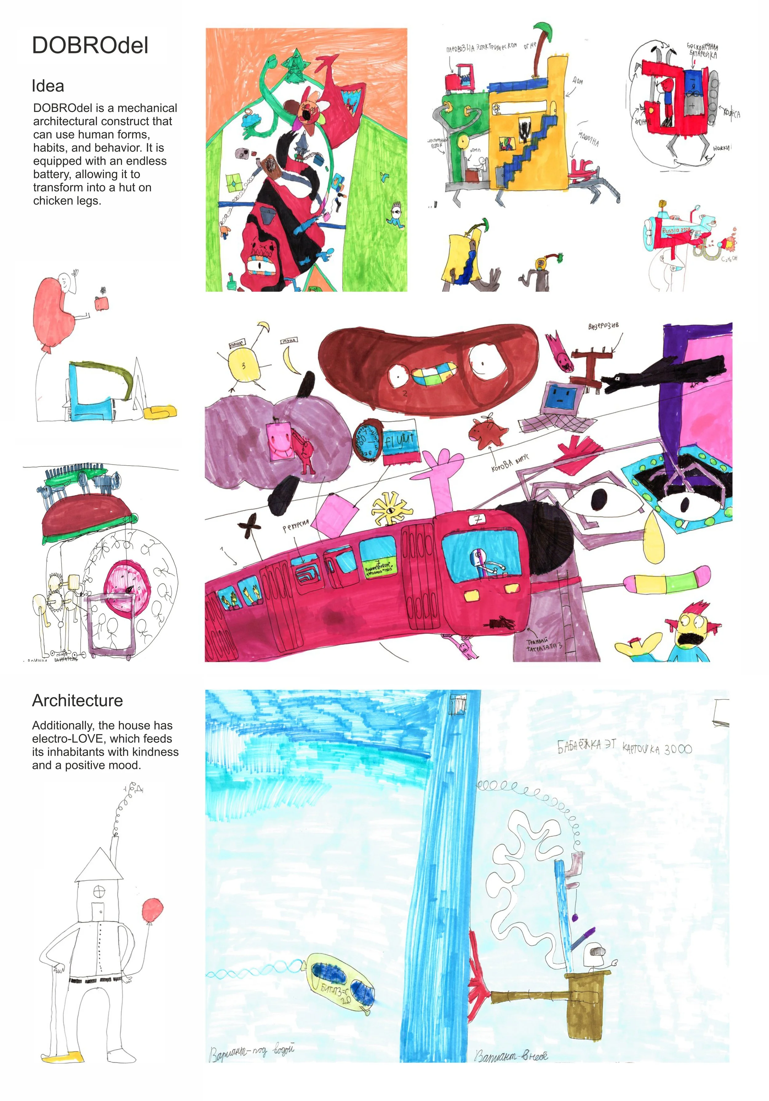 Description: The author proposes that the future should be viewed as a realm where humans and urban environments can interact in a playful manner. He imagines game spaces where people can directly exchange their ideas, moods, and thoughts with the city. DOBROdel is a structure designed to foster personal growth and enhance one's virtues. The house of the future is a mechanical architectural construct that can use human forms, habits, and behavior. It has the potential to actively contribute to the realization of noble goals – making the world a better place. The DOBROdel is equipped with an endless battery, allowing it to transform into a hut on chicken legs and helping people protect the environment from construction waste. Additionally, the house has electro-LOVE, which feeds its inhabitants with kindness and a positive mood.