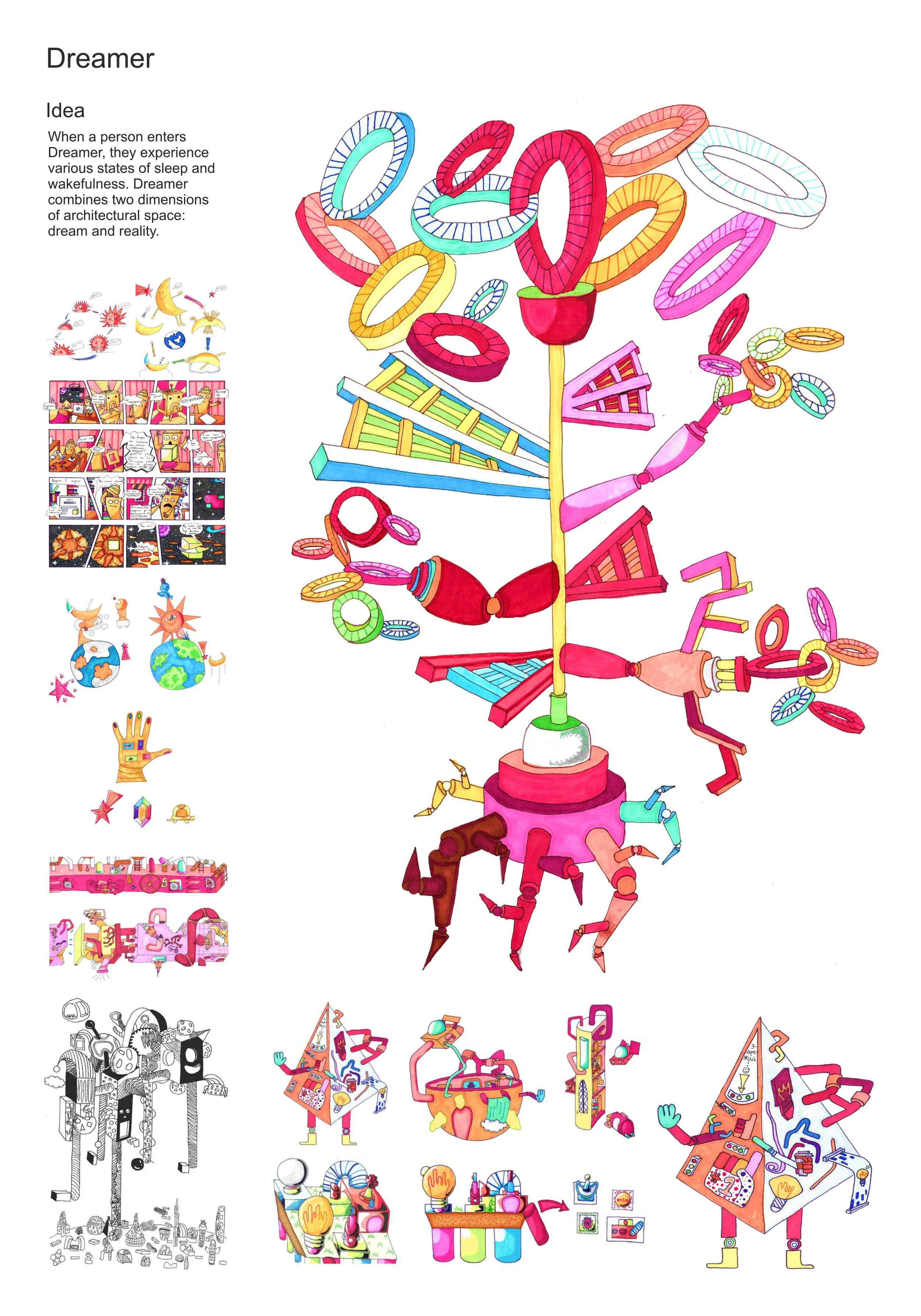 Description: Dmitri Mendeleev discovered the system of chemical elements while he was asleep. This shows that sleep is the key to the future. When a person enters Dreamer, they experience various states of sleep and wakefulness. Dreamer combines two dimensions of architectural space: dream and reality. This allows a person to explore their hidden skills and ideas. The architecture in Sonopticum can adjust the density of the airspace. This affects the quality and duration of sleep and wakefulness. By changing the chemical composition of the air, the city can design dreams with different content: nightmares for naughty townspeople or funny dreams for excellent students.