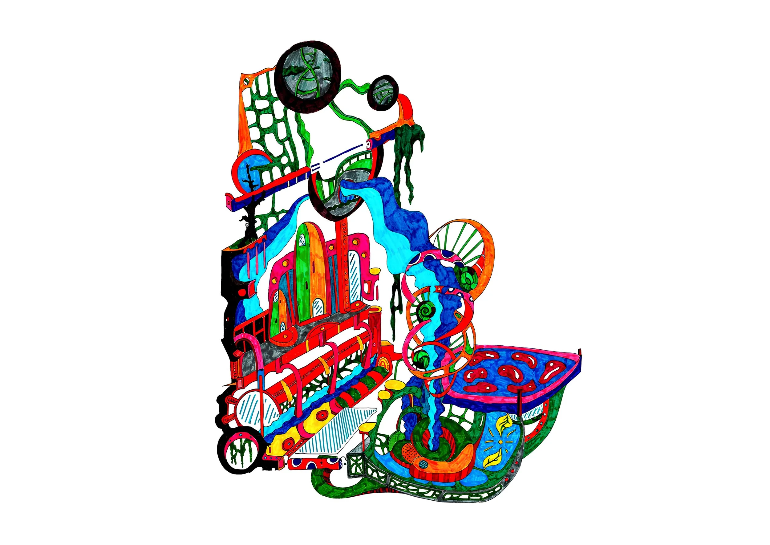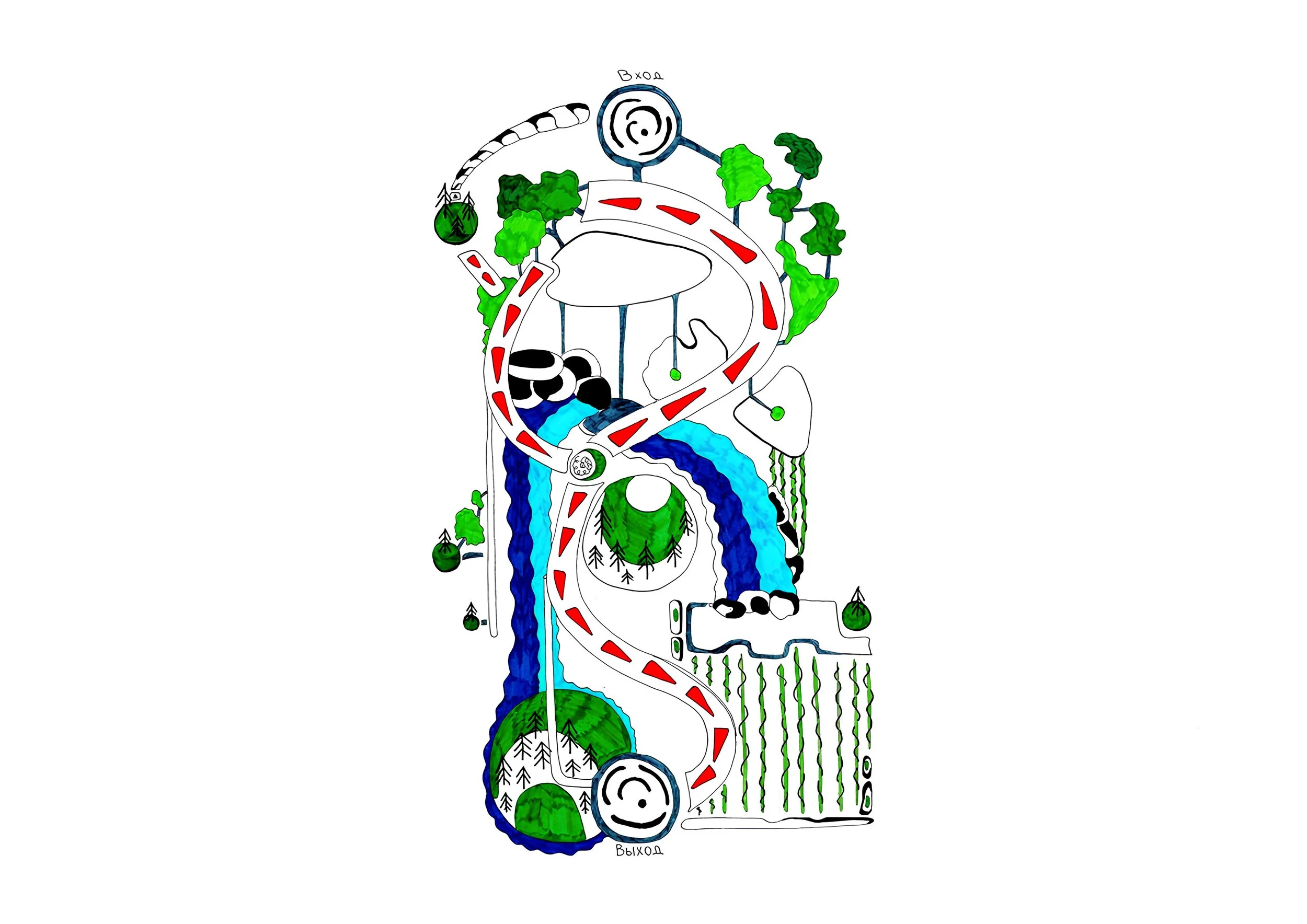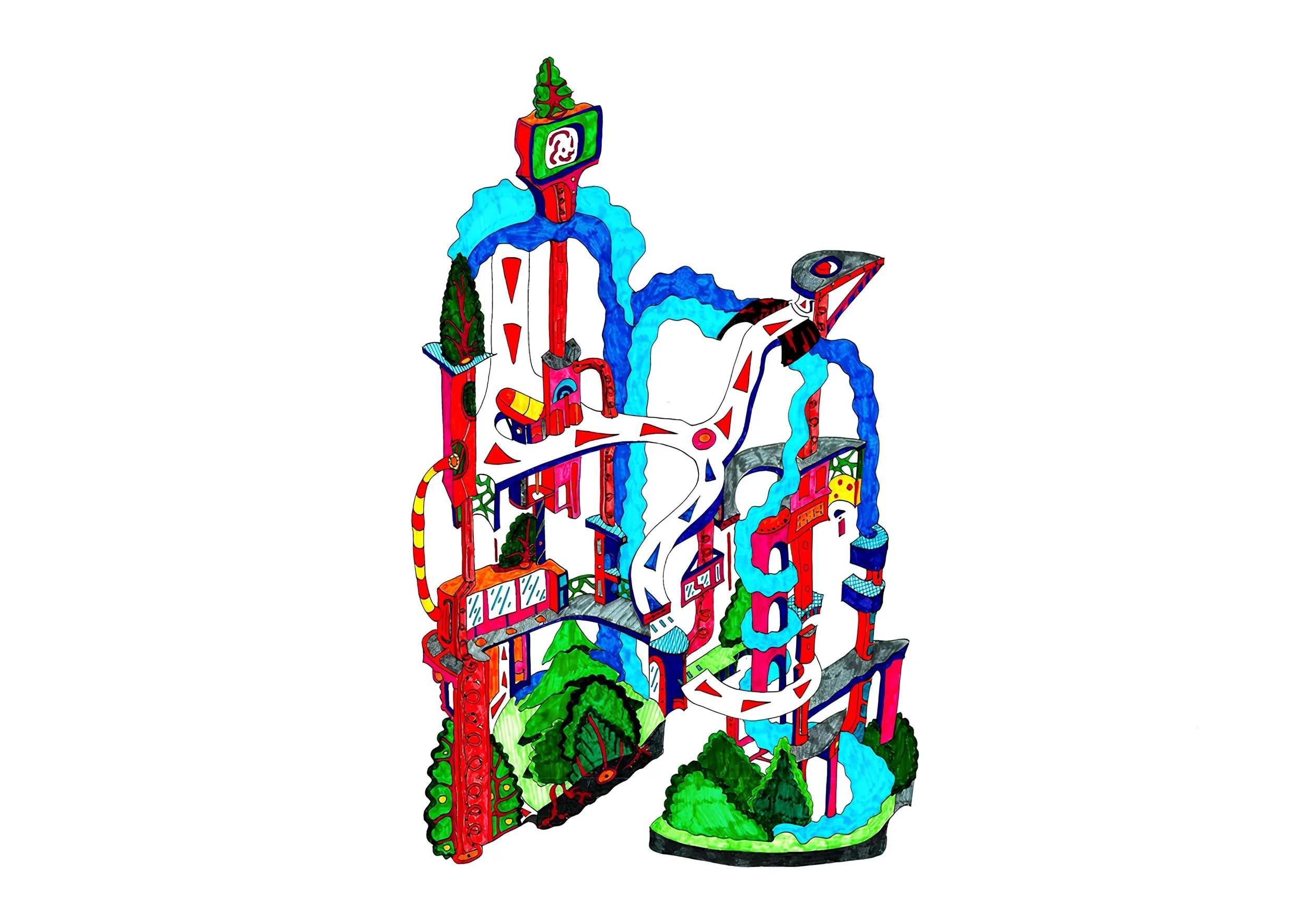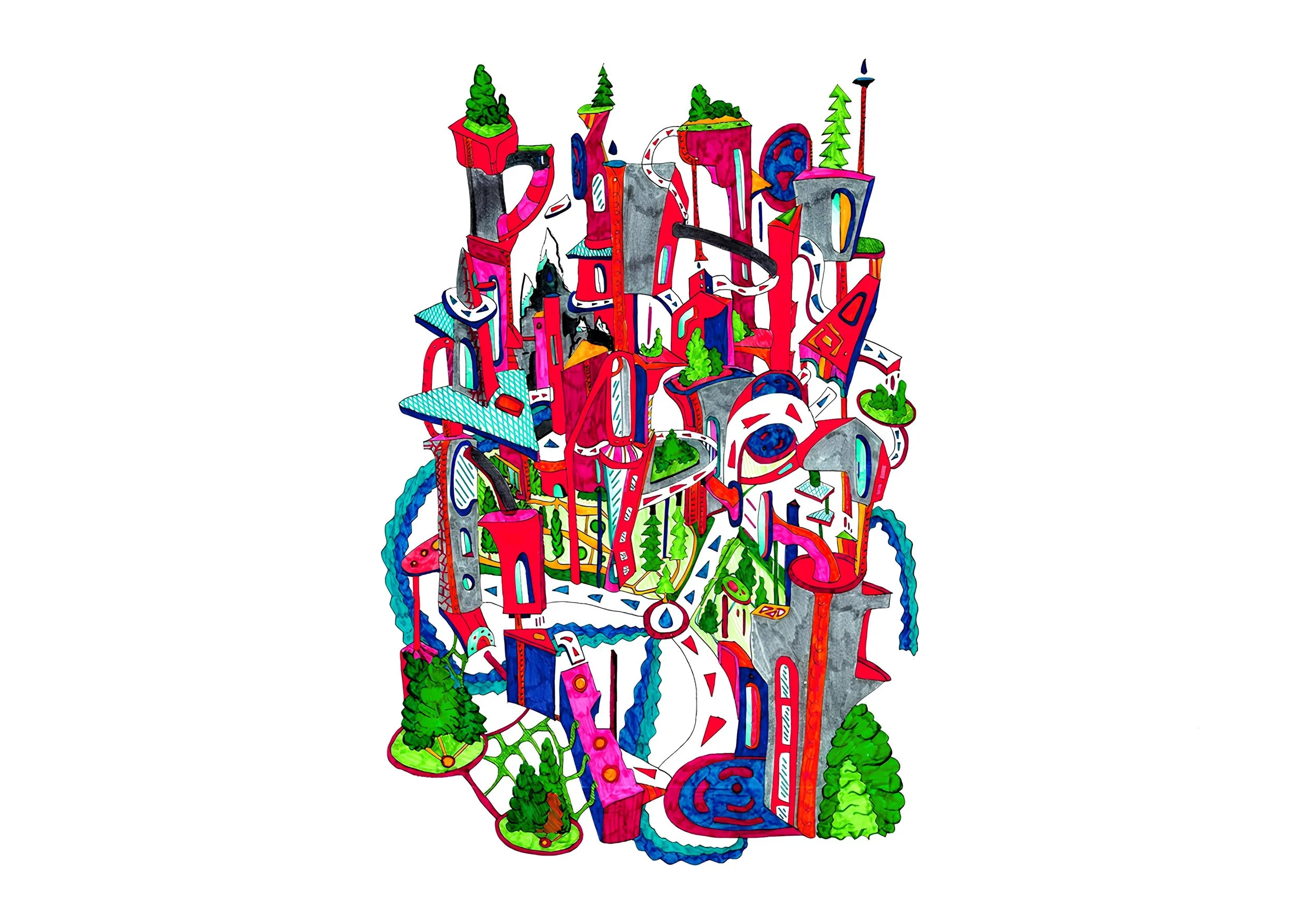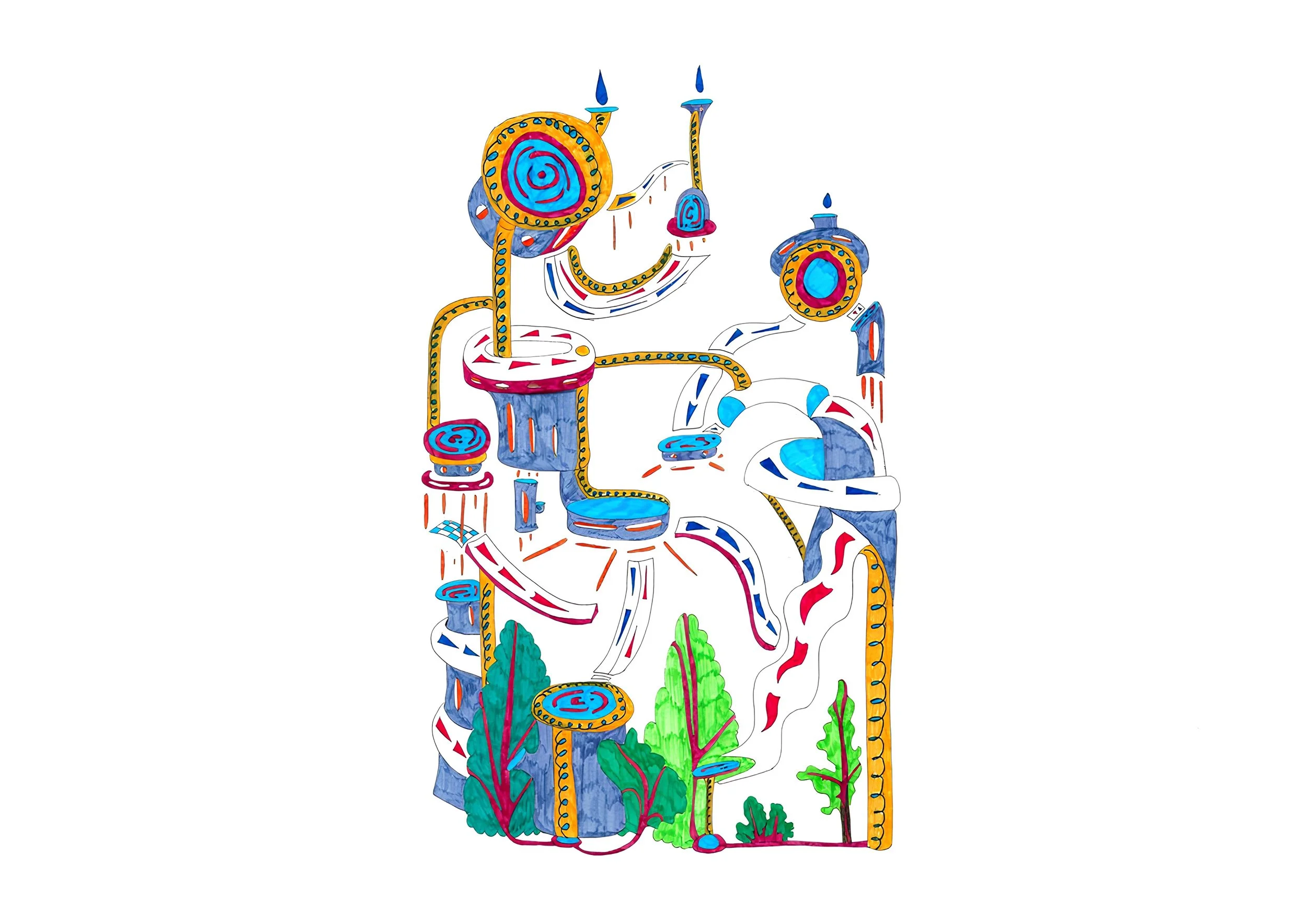 And in winter, the heat that has been building up all summer melts the snow. The water flows through pipes, roofs, walls, and floors to reach the very heart of the city — the wildland at the very bottom.
