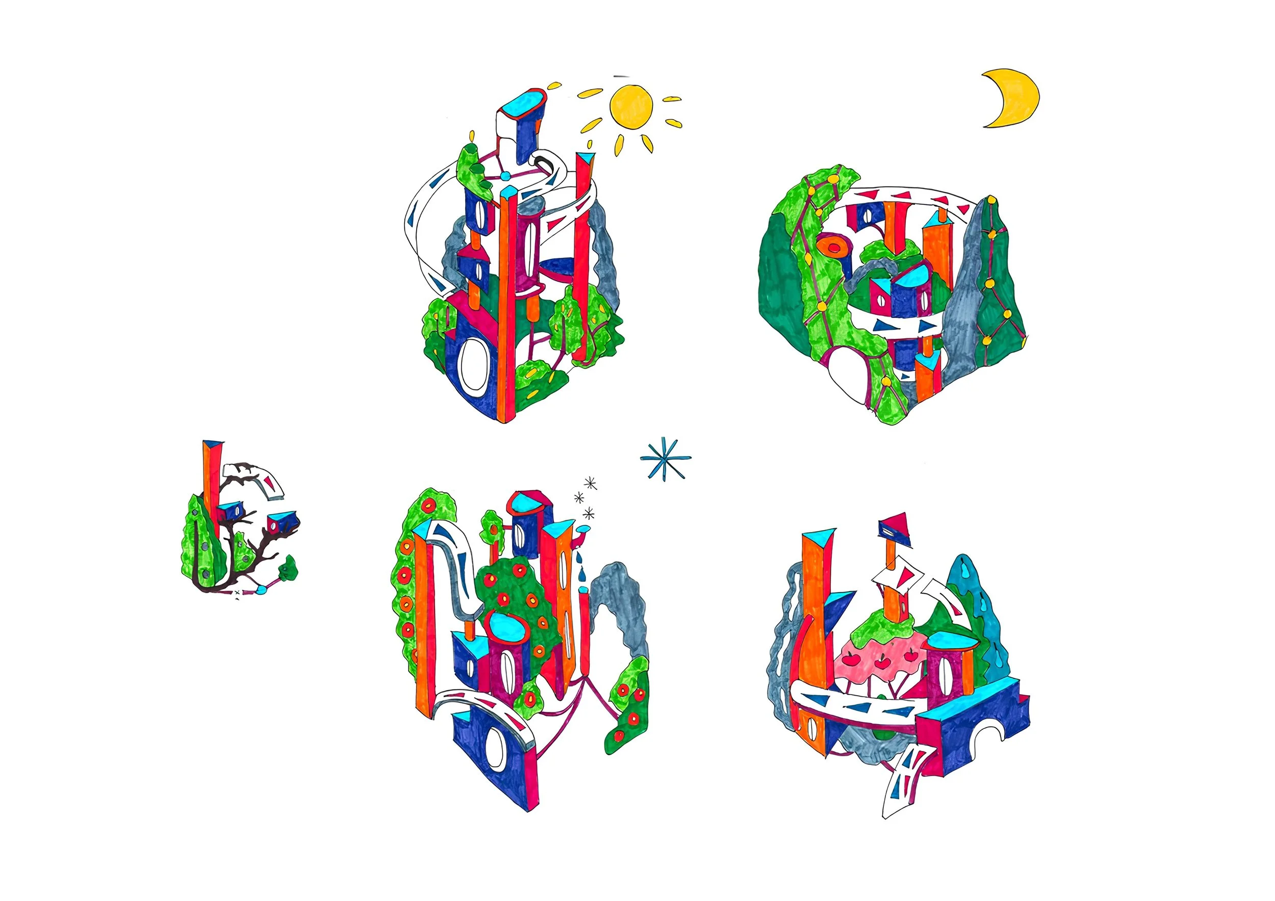 The author suggests a technology that can create various emotional states through architectural transformations. Fun: it gives off a warm glow and makes the architecture stand out in bright colors. Confidence: it creates very interesting spaces for exploring the world. Calmness: it warms the city, and tea leaves grow on the trees.