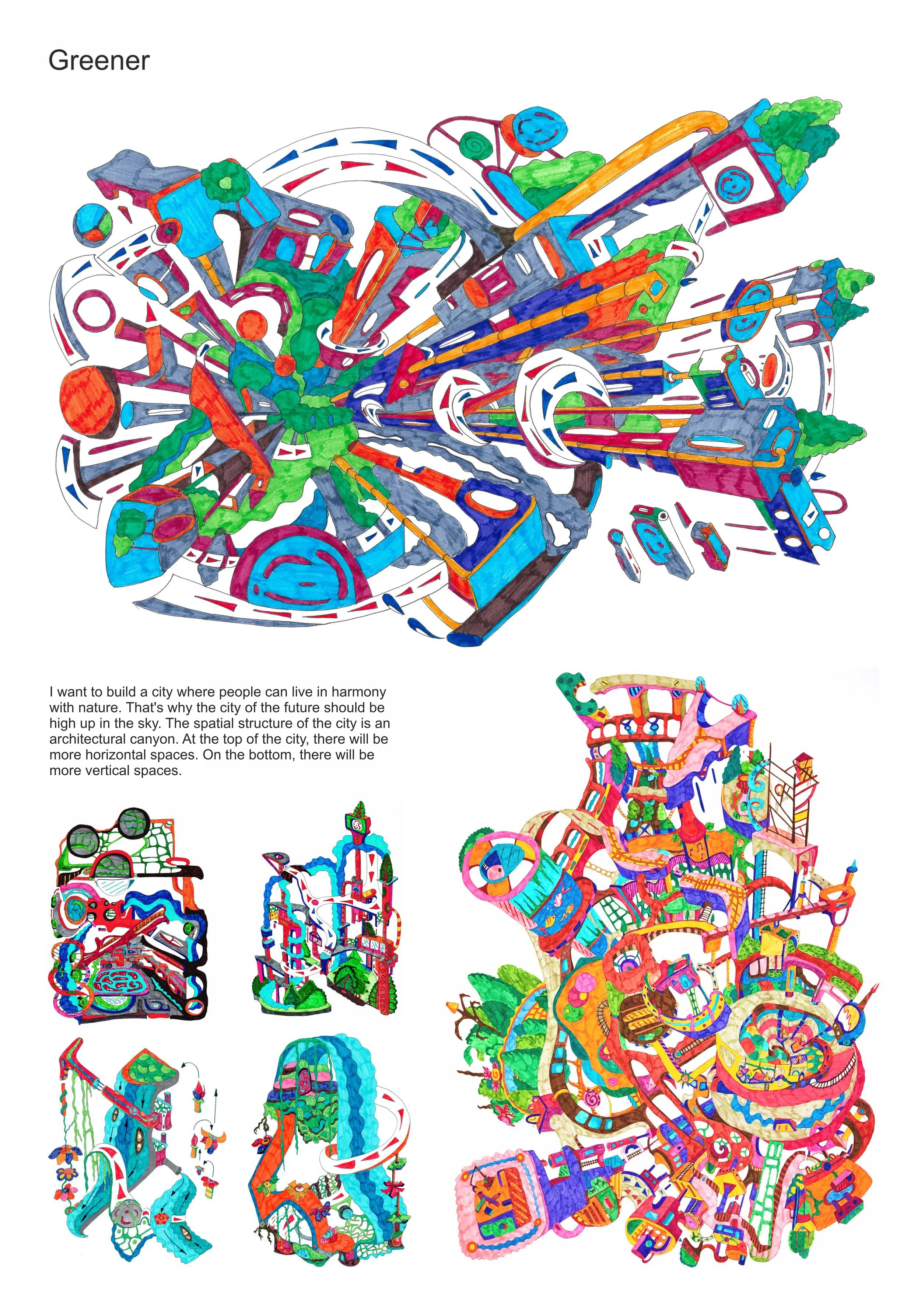 Description: I want to build a city where people can live in harmony with nature. That's why the city of the future should be high up in the sky. The spatial structure of the city is an architectural canyon. Light from the sky will cut through the city and determine the proportion of open spaces and buildings. At the top of the city, there will be more horizontal spaces. On the bottom, there will be more vertical spaces. The grass is always greener on the other side!